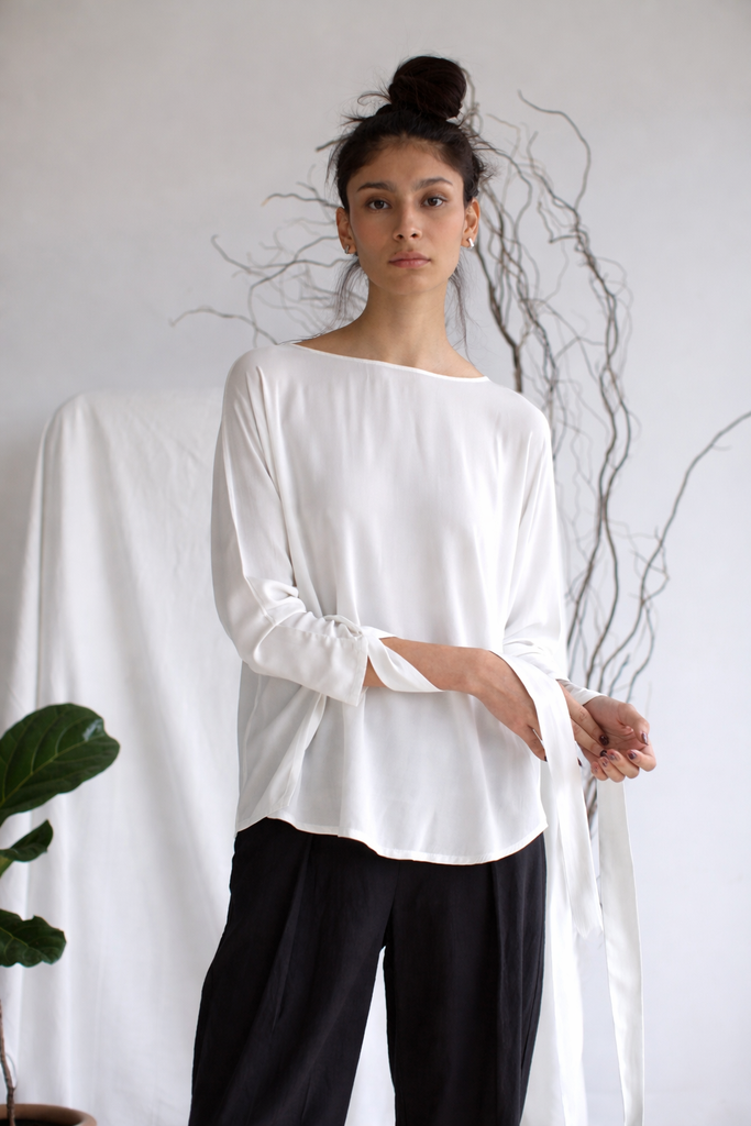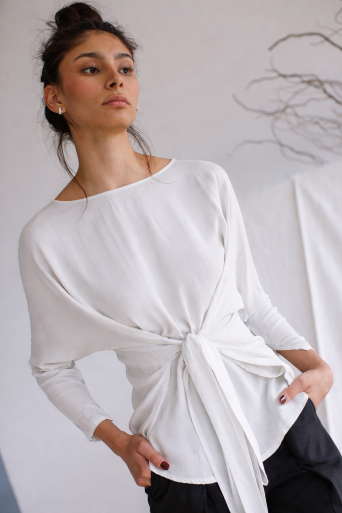 Top asimétrico, redondo por delante y cuadrado por detrás, con tiras en costados para amarrar en cintura o espalda.